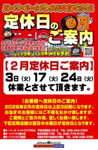 News Topics 新着情報 2026.01.01 2026年2月の定休日ご案内。 2026年2月の定休日は、下記の3日間になります。 2月3日(火)・2月17日(火)・2月24日(火) お急ぎのお客様にはご不便をお掛け致しますが、宜しくお願い致します。 近隣店舗のご利用をお願い致します。 戻る